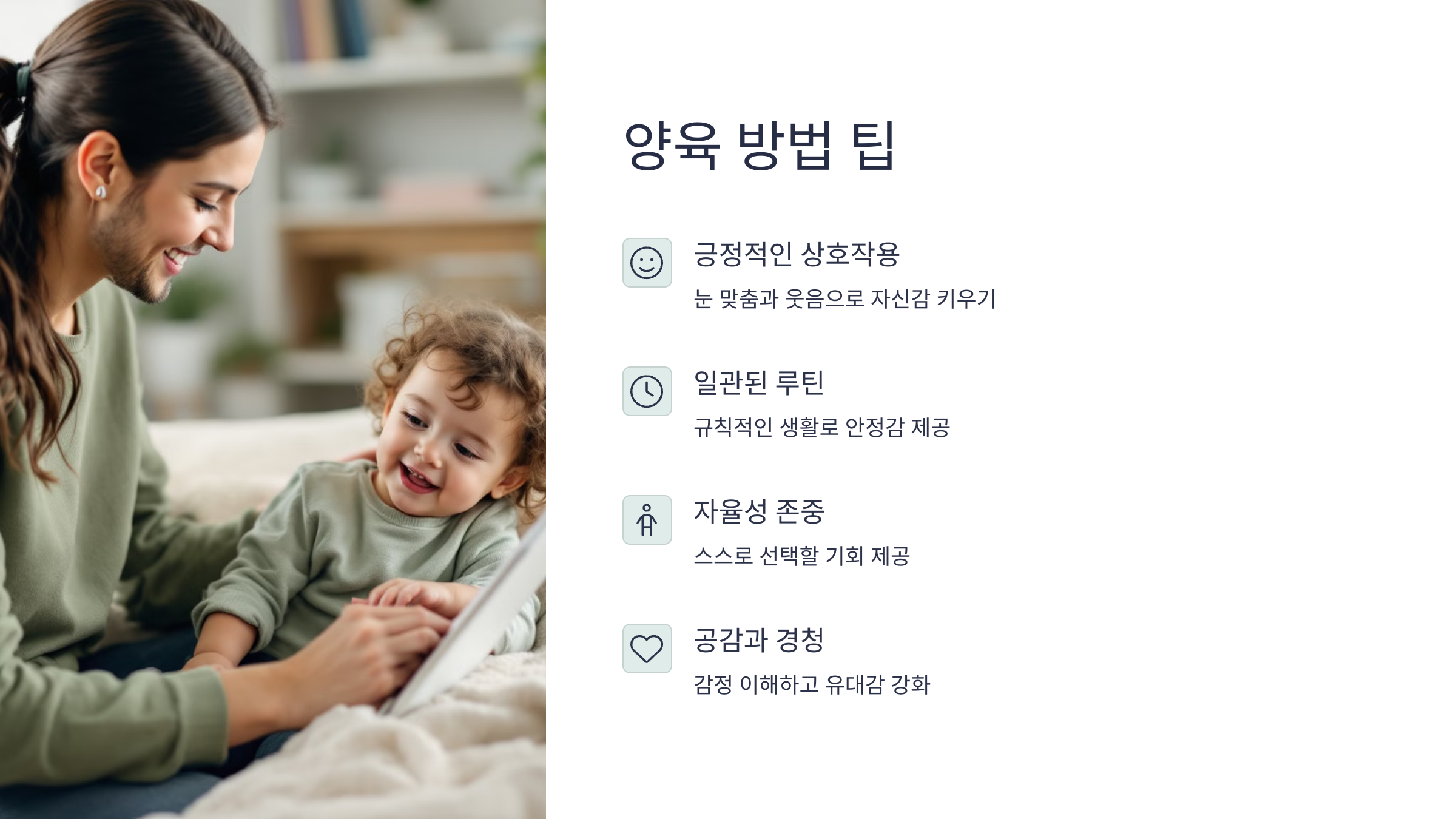 아이의 감정을 이해하고 공감하며 경청하세요. 이는 정서적 유대감을 강화하고 감정 조절 능력을 키워줍니다.