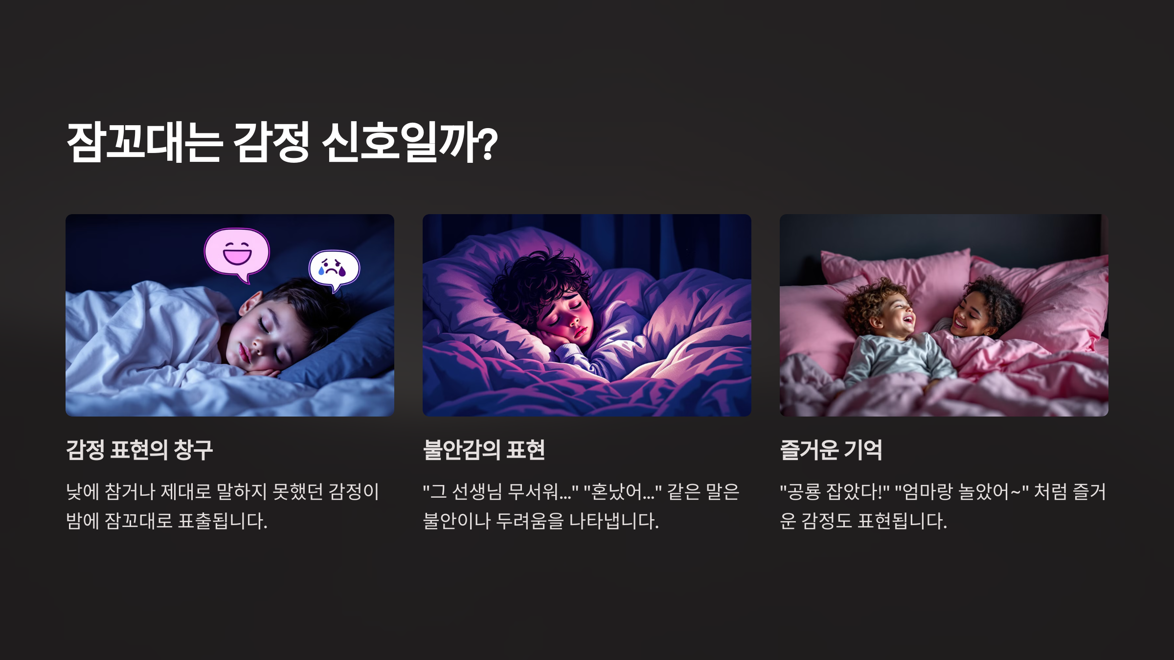 아이의 잠꼬대에는 말로 다 하지 못한 감정과 무의식의 메시지가 숨어 있을 수 있습니다.