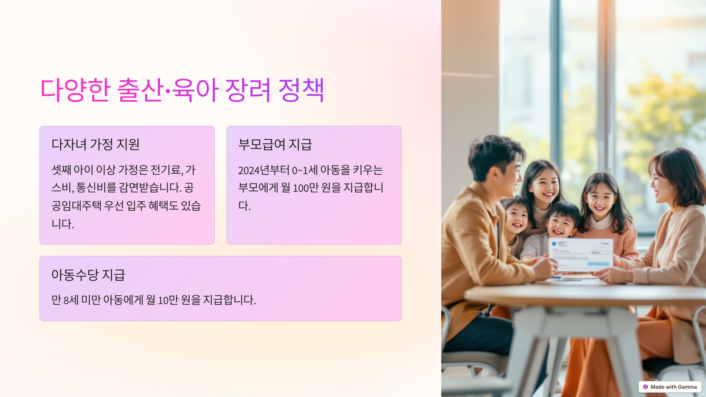 출산 지원금과 의료비 지원부터 육아휴직, 보육비 지원, 부모급여까지 체계적인 정책이 마련되어 있어 부모들이 보다