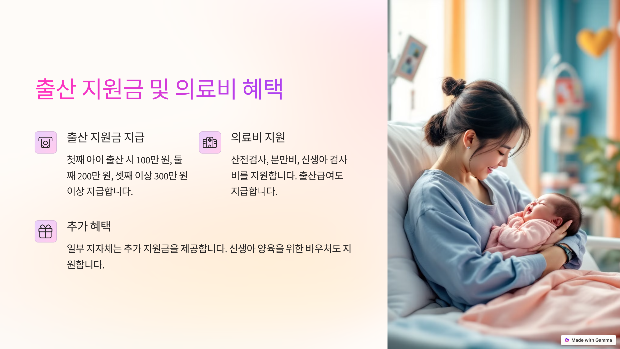 ※ 출산 지원금 및 의료비 혜택 (경제적 부담완화)