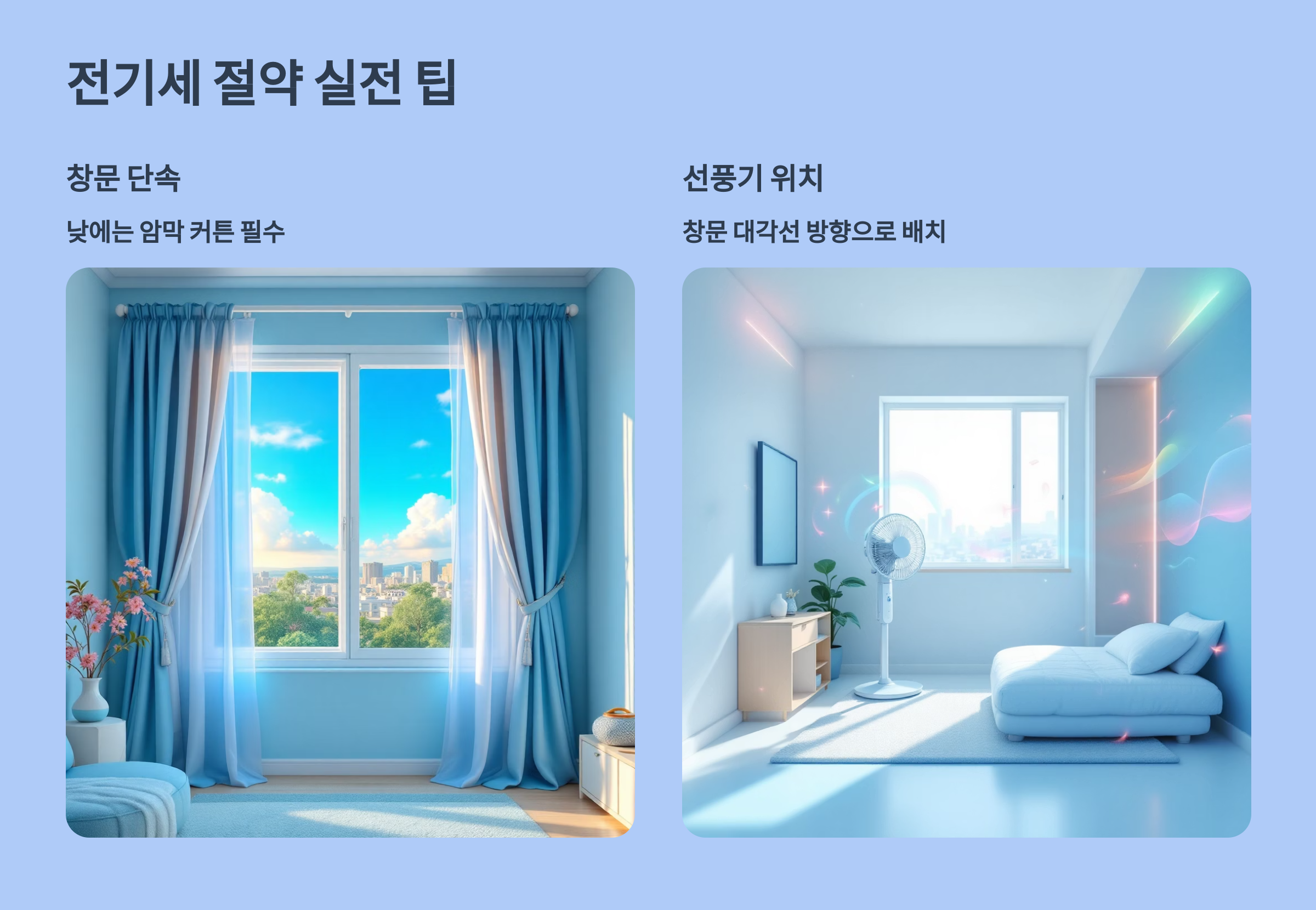 - 창문 단속: 낮에는 햇빛이 들어오지 않게 암막 커튼으로 차단하기