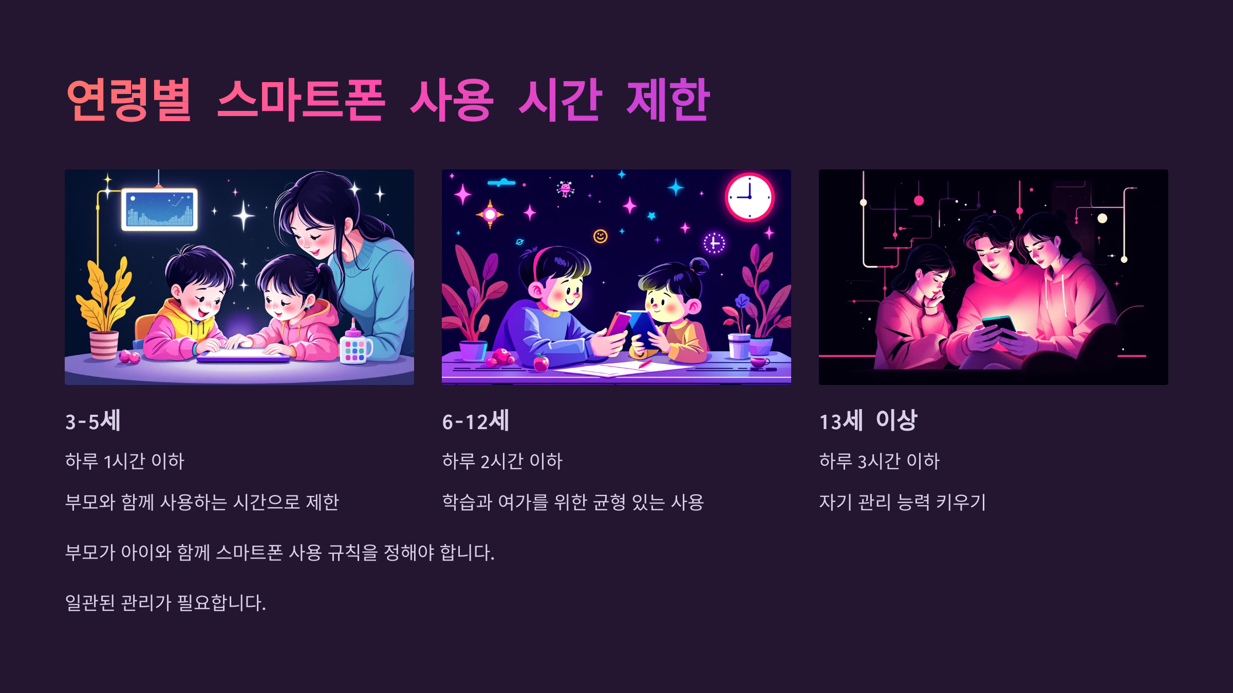 부모가 아이와 함께 스마트폰 사용 규칙을 정하고, 이를 지킬 수 있도록 일관된 관리가 필요합니다.